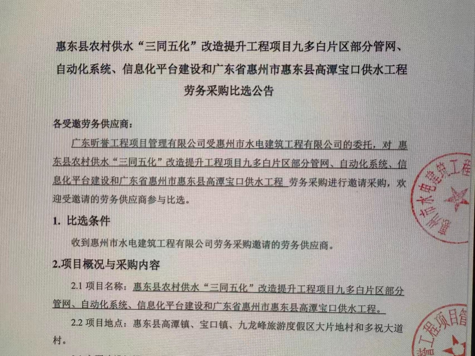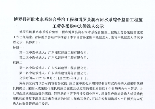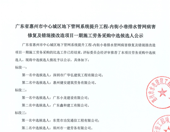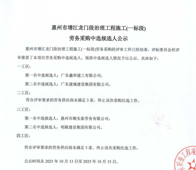 惠州市增江龍門段治理工程施工(一標(biāo)段)勞務(wù)采購中選候選人公示……